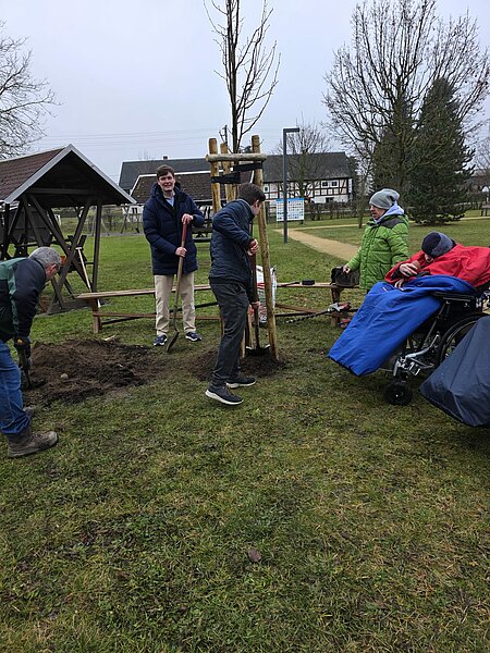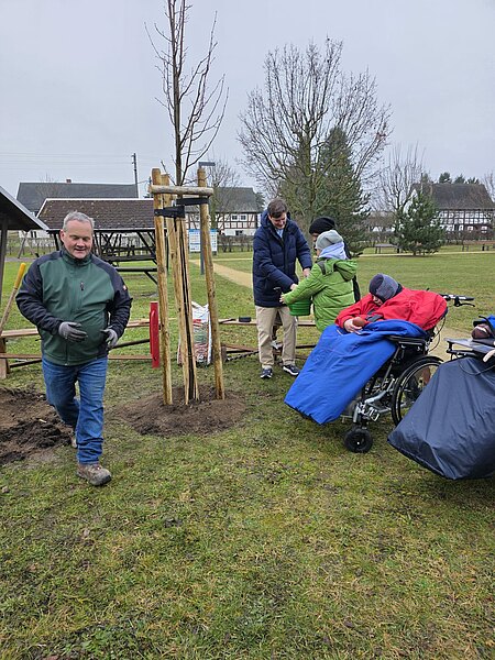 Gemeinsam mit Jens Freiberg von den Leutersdorfer Baumschulen und Bewohnerinnen und Bewohnern aus dem Katharinenhof wurde einen Sommerlinde im Garten gepflanzt und angegossen.