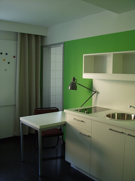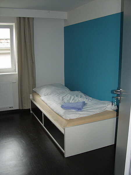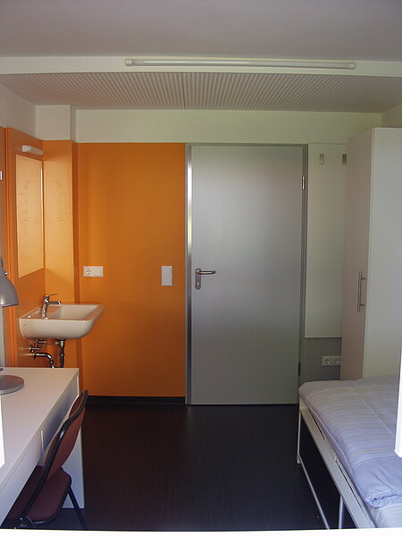 - Grundausstattung mit Bett, Schreibtisch, Kleiderschrank, Waschbecken