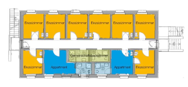Das "Sanatorium" bietet auf zwei Etagen jeweils 8 Einzelzimmer und 2 Appartments. Die Zimmer enthalten folgende Ausstattung: